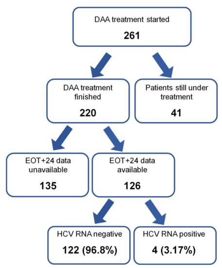 DAA treatment was initiated in 261/317 (82.3%) HCV-RNA-positive patients. The treatment was not commenced in 56 (17.7%) patients for various reasons shown in Table 3. Out of the 261 initiated therapies, it was concluded for 220 (84.3%) patients to date, while 41 (15.7%) treatments were ongoing at data lock.