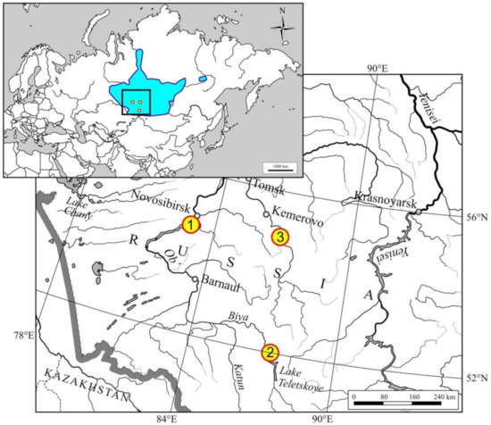 Map, showing the locations of the collection sites in West Siberia, Russia, where hantavirus-infected Siberian moles were captured. (1) Academgorodok, (2) Teletskoye, (3) Azhendarovo. The inset shows the geographic range of Talpa altaica (area colored in blue).