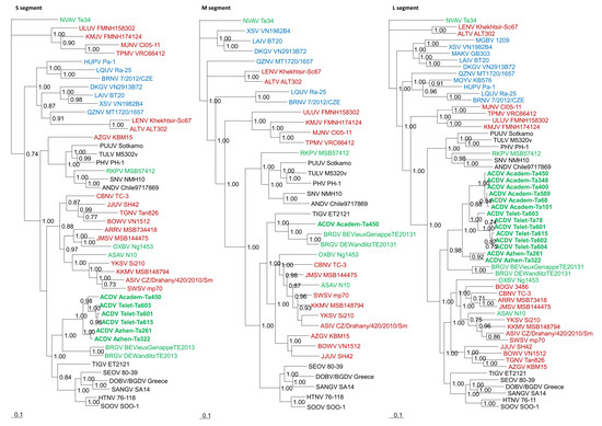 - Maes, P.; Adkins, S.; Alkhovsky, S.V.; Avšič-Županc, T.; Ballinger, M.J.; Bente, D.A.; Beer, M.; Bergeron, E.; Blair, C.D.; Briese, T.; et al. Taxonomy of the order Bunyavirales: Second update 2018. Arch. Virol. 2019, 164, 927–941. [Google Scholar] [CrossRef] [PubMed] [Green Version]