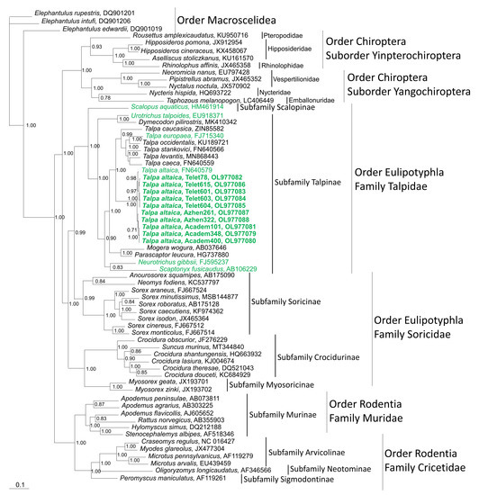 Bayesian phylogenetic tree based on 1140 nucleotides of the cytochrome b mtDNA of shrews and moles (order Eulipotyphla, families Talpidae and Soricidae), rodents (order Rodentia, families Muridae and Cricetidae), and bats (order Chiroptera, suborders Yinpterochiroptera and Yangochiroptera). The tree was rooted using Elephantulus (order Macroscelidea, GenBank Nos. DQ901019, DQ901206, and DQ901201) as the outgroup. FN640579 is from a Siberian mole captured in Teletskoye. Talpa altaica from this study are shown in bolded green lettering. Other mole species harboring hantaviruses are shown in unbolded green lettering. The number at each node indicates posterior probability values (>0.7), based on 15,000 trees: two replicate Markov chain Monte Carlo runs, consisting of six chains of one million generations each sampled every 100 generations with a burn-in of 2500 (25%). The scale bar indicates the number of nucleotide substitutions per site. GenBank accession numbers are shown for taxa.