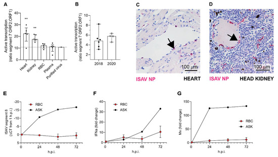 ISAV predominantly replicates in endothelial cells of solid organs. (A,B) Active viral transcription was estimated by calculating the ratio between ISAV segment 7 mRNA and RNA. Dots show values in individual fish, bars show median and interquartile ranges. (A) ISAV transcription in heart and kidney was higher than in RBC, plasma, and purified ISAV (13 d.p.i., 2020 trial). Stars indicate the difference between active transcription in RBC compared to heart (** p = 0.0087) and head kidney (** p = 0.0079), Mann–Whitney U. (B) ISAV transcription in full blood from fish harvested 12 and 13 d.p.i. in the 2018 trial (2018) and in erythrocytes harvested 13 d.p.i. in the 2020 trial (2020), detecting no significant difference between trials. (C,D) Micrographs showing immunostaining for ISAV nucleoprotein (NP, magenta) in formalin-fixed paraffin-embedded heart (C) and head kidney (D) from fish harvested 13 d.p.i. in the 2020 trial. Arrows point to ISAV NP-positive endothelial cells. Scalebars are 100 µm. (E–G) RBC from healthy fish were infected ex vivo with ISAV and harvested 1, 24, 48, and 72 h post infection (h.p.i.). qPCR was used to measure (E) ISAV segment 8, (F) IFNa, and (G) Mx transcripts. ELF-1α was used as reference for calculating fold change in F and G by the ΔΔCT method. The graphs show means +/− standard deviations from RBC from 4 individual fish. A representative time curve of results from infected ASK cells is included as reference.