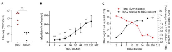 Erythrocytes sequester infective ISAV particles and inhibit serial infection of cultured cells. (A) Density gradient-purified erythrocytes (RBC) and plasma samples were harvested from ISAV-infected fish (13 d.p.i. in the 2020 trial) and inoculated on ASK cells. Data points represent samples from individual fish. ** p = 0.079, Mann–Whitney U. (B) Serially diluted RBC from healthy fish were added to infected ASK cells 24 h p.i. and incubated another 24 h before supernatants were transferred to new ASK cells. Infection of ASK cells 72 h.p.i. was measured by immunostaining for ISAV NP and automated quantification of the number of infected cells (Spectramax i3x plate reader, minimax 300 Imaging Cytometer module, Molecular devices, CA, USA). The infectivity graphs show medians (dots) and 95% confidence intervals (bars), representative of two independent experiments. *** p < 0.001, ** p < 0.01, one sample t test. (C) Serially diluted RBC from healthy fish were incubated with ISAV. The total levels of ISAV RNA associated with the diminishing RBC pellets were measured by qPCR (red, left y-axis). ISAV RNA relative to the RBC content in the pellet was calculated by the ∆∆CT method, using ELF1α as reference gene and the highest dilution of RBC with ELF1α CT < 35 (considered the reliable limit of detection) as reference sample (black, right y-axis, open circle indicates ELF1α CT > 35). Data show the means of technical duplicates representative of two independent experiments.