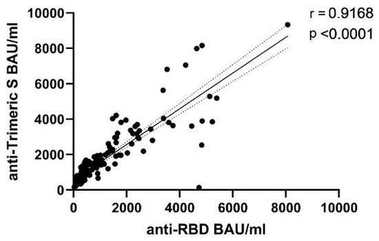 Correlation between SARS-CoV-2 anti-RBD IgG and anti-Trimeric S IgG antibodies. Results were expressed in BAU/mL. Spearman’s test was used for correlation analysis. Dotted lines represent 95% Confidence Interval (CI) of the best-fit line in linear regression analysis.