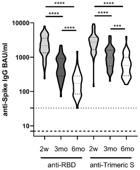 Moreover, the analysis of anti-RBD and anti-Trimeric S IgG in the serum samples longitudinally collected after the second dose of BNT162b2 mRNA COVID-19 vaccine was performed (Figure 2).