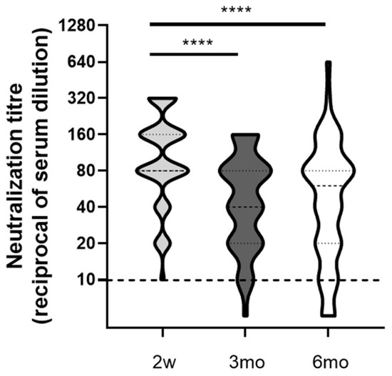 Neutralizing antibody titers in serum samples longitudinally collected (2w, 3mo, and 6mo). Neutralization titers are presented as reciprocal of serum dilution. Nab titer <10 is considered negative (not neutralizing). Dot line indicates the limit of Nab quantification (10). **** p < 0.0001.