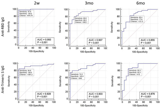 ROC analysis performed showing Anti-Trimeric S IgG and Anti-RBD antibody titers and their corresponding neutralization activity. ROC curves were obtained considering the antibody titers of the 52 individual samples measured at 2w, 3mo, and 6mo after the second dose of BNT162b2 mRNA COVID-19 vaccine. The curves were built using as cut-off a medium NAb titer ≥ 40.