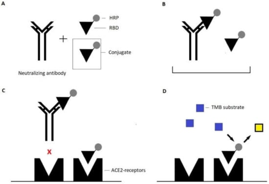 Principle of the TECOmedical SARS-CoV-2 Neutralization Antibody ELISA. (A) Serum samples and conjugate (HRP-labelled SARS-CoV-2-SP-RBD) are premixed. (B) During incubation, neutralizing antibodies (anti-SARS-CoV-2-RBD-IgG) and the conjugate form antibody–antigen complexes. (C) The mixture is added to the solid phase; preformed complexes are unable to interact with ACE2-receptors; unbound conjugate can interact freely. (D) Tetramethylbenzide substrate is added and reacts with HRP; the measured optical density is inversely correlated with the concentration of neutralizing antibodies. Yellow square: color change after enzymatic reaction.