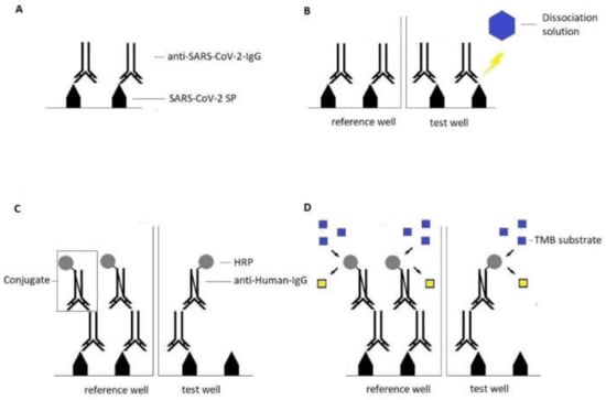 Principle of the DIA-SARS-CoV-2-S-IgG-av avidity assay. (A) Serum samples are added to the solid phase in duplicate (reference wells and test wells); present anti-SARS-CoV-2-RBD-IgG are bound to the antigen (recombinant SARS-CoV-2-spike protein) on the solid phase. (B) The test wells are treated with dissociation solution to destroy antibody-antigen complexes formed by low avidity antibodies. (C) Remaining antibody-antigen complexes are detected by the conjugate (HRP-labelled monoclonal anti-human-IgG). (D) Tetramethylbenzide substrate is added and reacts with HRP; the reference well indicates whether the sample contains a sufficient amount of IgG or not, if the first applies, the test well is used to calculate the RAI (Relative Avidity Index). Yellow square: color change after enzymatic reaction.