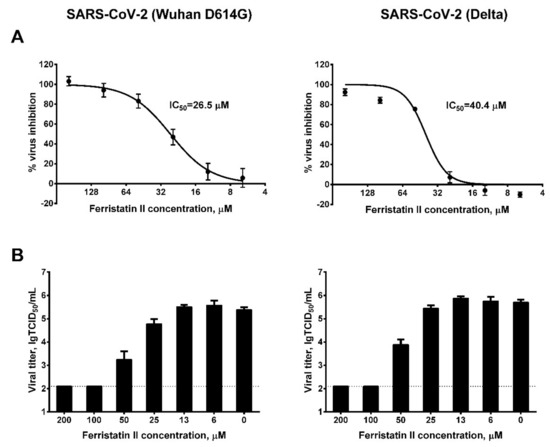 Inhibition of SARS-CoV-2 replication in Vero cells by ferristatin II. (A) Assessment of the levels of virus neutralization by the detection of RBD antigen in the cells by cell-based ELISA. (B) Assessment of viral titers in cell supernatants by quantitative real-time RT-PCR. The dotted line represents the limit of viral RNA detection. IC50: 50% inhibiting concentration. Data are presented as the mean ± SD (n = 3).