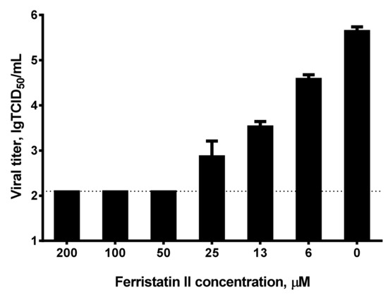 Cytotoxicity of ferristatin II for Vero cells was assessed by the 3-(4,5-Dimethylthiazol-2-yl)-2,5-diphenyltetrazolium bromide (MTT) reduction assay [20]. Two-fold dilutions of ferristatin II were prepared in DMEM/2%FBS medium starting from 400 µM concentration and added to the wells of 96-well plates with Vero cell monolayers. After 48h incubation, the media were removed and the cells were gently washed with warm PBS. The 0.5 mg/mL MTT reagent was added to each well in a volume of 100 µL, and the plate was further incubated at 37 °C for 2 h. Then, the reagent was removed and the cells were washed with PBS and air-dried, followed by the addition of 100 µL of 96% ethanol to dissolve formazan crystals. The color intensity was recorded using a spectrophotometer at a wavelength of 535 nm. Wells of the plate not seeded with Vero cells were used as negative controls. The 50% inhibition of cell viability (CC50) was calculated by four-parametrical non-linear regression analysis using GraphPad Prizm software.