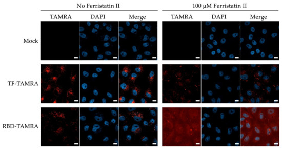 Vero cells were cultured for 18 h in DMEM/2%FBS without ferristatin II and with the addition of 100 µM ferristatin II with coverslips for microscopy previously placed on the bottom of the culture plates. Then, the medium was replaced for 1.5 h with medium without FBS containing 1.2 µM Fe2-TF-TAMRA (0.25 mg/mL) or 1.2 µM RBD-TAMRA (0.1 mg/mL). After incubation, the cells were gently washed twice with PBS, fixed with 4% paraformaldehyde (w/v) in PBS for 10 min, washed twice with PBS for 30 min. Then, nuclei of the cells were stained with 360 nM DAPI for 5 min, washed with PBS and coverslips, and mounted on the slides using a polymerizing resin for fluorescence microscopy (DAKO, Glostrup, Denmark). Images were acquired using an Axio Obserever.Z1/7 confocal laser scanning microscope (Carl Zeiss, Jena, Germany), with a Plan-Apochromat 63×/1.40 Oil DIC M27 objective. A 561 nm laser was used to excite TAMRA fluorescence, a 570–700 nm filter was used to record fluorescence, a 405 nm laser was used to excite DAPI, and a 400–570 nm filter was used to record fluorescence. Images were acquired and processed using the software provided with the microscope.