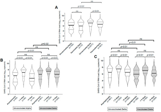 SARS-CoV-2 RNA loads in nasopharyngeal specimens from infected individuals. Data are represented as violin plot with medians (thick midlines) plus interquartile range (IQR) (top and bottom dotted lines). The number of patients in each group and the p values for comparisons between groups (Mann–Whitney U-test) are shown. ns: not significant. (A) Viral loads in subjects with different variants (Alpha/Delta) and their immunization status. (B) Viral loads of unvaccinated COVID-19 patients infected with the Delta and Alpha variants, according to symptoms and sampling time after symptom onset. (C) Viral loads of unvaccinated and fully vaccinated COVID-19 patients infected with the Delta variant, according to symptoms and sampling time after symptom onset.