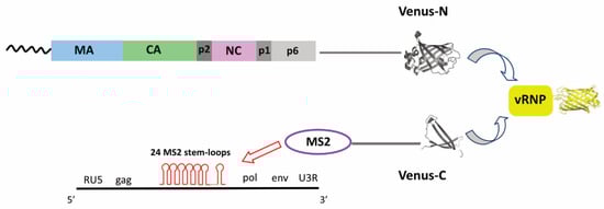 In BiFC assays, the two halves of Venus fluorescent protein are fused to two interacting proteins of interest, as for example Gag and MS2 proteins [147]. One of the most widely used strategies to monitor gRNA trafficking in cells consists in the insertion of 24 stem-loop sequences in the target RNA which are then recognized with high affinity and specificity by the bacteriophage MS2 coat protein. While the two halves of Venus protein are non-fluorescent, the interaction of the partners tethers the fused fluorescent fragments in proximity, which facilitates the restoration of Venus fluorescence. BiFC is a reliable and sensitive approach that also revealed molecular interactions in other viral contexts, such as the Herpes virus [148].