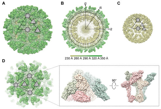 The GETV (SC483) was isolated from clinically healthy pigs in Sichuan Province in 2018 by our laboratory and was maintained in Vero cells. The supernatant containing mature virions was harvested and purified by ultracentrifugation. To obtain a high-resolution structure of GETV virions, we first applied icosahedral symmetry to the reconstruction. A total of 30,996 viral particles were involved in this process, and obtained the structure at a global resolution of 4.6 Å (Figure S1A,B,D, and Table S1). To overcome the heterogeneity of the particles and further improve the resolution, we then used the block-based reconstruction method to further refine the structure [35]. The three blocks of the T = 4 icosahedral lattice were as follows: Block 1 as the icosahedral five-fold of type-2 quasi-three-folds (B1), Block 2 as four type-2 quasi-three-folds flanked by two type-1 symmetrical trimers across the icosahedral two-fold axis (B2), and Block 3 was one type-1 symmetrical trimer surrounded by three type-2 quasi-three-folds about the icosahedral three-fold axis (B3) (Figure S1C). Each block was refined and reconstructed separately, and the final resolutions of the three blocks were assessed by the gold standard Fourier shell correlations (FSC, 0.143) to be 3.5 Å, 3.7 Å, and 3.7 Å, respectively (Figure S1D,E). The three-dimensional reconstruction clearly showed the organization of dual nested shells of GETV virions, an outer glycoprotein shell, and an inner nucleocapsid shell (Figure 1A–C). Like other alphaviruses, the diameter of the integrated GETV particle is about 700 Å, and that of the nucleocapsid is about 410 Å. The outer glycoprotein shell is constructed by 80 trimers, each of which is composed of three copies of E1 and E2 heterodimers (Figure 1A). The inner nucleocapsid shell is composed of 240 copies of CPs (Figure 1C). Both glycoproteins and CPs are arranged following T = 4 symmetry in forming two icosahedron shells. Each asymmetric unit (ASU) of the virion contains four E1/E2 heterodimers and four CPs (Figure 1D). A slice through the 3D density map (Figure 1B) shows the outer glycoprotein shell and inner nucleocapsid shell is connected by the interaction between CPs and cytoplasmic tails of E1 and E2. In the density map of GETV virions, we did not find the densities that correspond to E3 in SINV [20] and CHIKV [21].