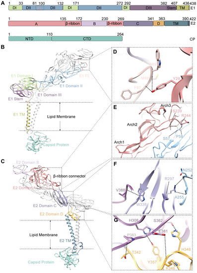 Structure of E1/E2 heterodimer. (A) Linear diagrams show the subdomain distributions in E1, E2, and CP with different colors (DI, light green; DII, light blue; DIII, purple; FL, peach puff; TM of E1, olive; domain A, Indian red; domain B, orchid; domain C, medium purple; domain D, orange; TM of E2, slate blue. CP, turquoise). (B,C) The atomic models of GETV heterodimer displayed with edged ribbon. Subdomains of E1 and E2 are color coded in the same way as (A). (D–G) The primary hydrogen bonds formed between E1 and E2 are labeled with dashed lines.