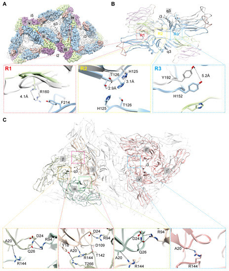 There are five types of interactions between two neighboring E1 on the virion. These interactions are formed between icosahedral 3-fold (i3) axis and quasi-3-fold (q3) axis, two neighboring q3, 2-fold (i2) axis and i3, i2 and q3, and near icosahedral 5-fold (i5) axis; the interactions are designated as types i, ii, iii, iv, and v, respectively (Figure 3A, Table S3). Type i and type ii correspond to the previously described Type I and Type II interactions, respectively [20]. Unlike the constant interaction between the two E1 in type i, the distance between the two E1 in type ii is closer near the i5 axis but is separated away from i5 (Figure 3A). To find the conformational changes between type i and type ii interactions, we overlapped the two E1 from q3 and observed the structural differences between the E1 from i3 and q3. Three contact regions (R1, R2, and R3) between the two E1 were found in the type i interaction, but only one (R1) was found in the type ii interaction (Figure 3B). We then compared the conformational differences of the primary amino acids in these three regions of the two type interactions. In R1, the distances between residues in E1 of type ii are closer than that of type i, as indicated by the displacement of R160 (Figure 3B, R1), leading to a more extensive interface that may compensate for the missing interactions in R2 and R3. The absent interactions in type ii result from the upward movement of involved residues as shown in Figure 3B (R2 and R3), the residues T126 and H125 in R2 and Y192 in R3 do not make contact with their counterparts. These differences in the interaction between two adjacent E1s may contribute to the maintenance of the spherical surface of viral particles and play essential roles in viral particle assembly.