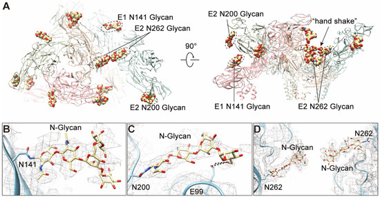 The N-linked glycans in E1 and E2. (A) Top view and side view of an asymmetric unit (ASU) showing the locations of the N-linked glycans. The E1/E2 heterodimers are colored blue, green, wheat, and pink, respectively. (B–D) Local density and structure of the three N-linked glycans. The glycan linked on N141 from E1 is shown in (B); The glycan linked on N200 from E2 has a close contact with E99 by forming a hydrogen bond (C); The glycans linked on N262 from two adjacent E2 form a “hand shake”-like structure (D).