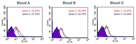 The binding preference of SARS-CoV-2 spike proteins to blood group A, B, and O RBCs. The histograms of spike protein S1 subunits binding with blood group A, B, and O RBCs show a 51.02%, 36.29%, and 21.07% shift in mean fluorescence intensity (MFI), respectively (red line). The histograms of spike protein S2 subunits binding with blood group A, B, and O RBCs show a 27.53%, 26.79%, and 13.26% shift in MFI, respectively (blue line).