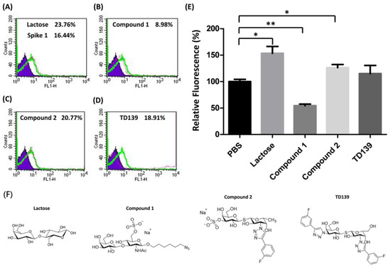 The binding efficiency of the SARS-CoV-2 spike protein S1 subunit to blood group A RBCs affected by carbohydrate derivatives. (A) The histogram of spike protein S1 subunit binding with blood group A RBC cells shows a 16.44% shift in MFI without carbohydrate inhibitors. Lactose and three sulfated carbohydrate derivatives were preincubated with spike protein S1 subunit then subjected to the binding assay. The histograms of spike protein S1 subunit binding with blood group A RBC cells are shown (green line). The MFI shifts of blood group A RBC cells with carbohydrate derivatives tested are (A) lactose, 23.76%; (B) compound 1, 8.98%; (C) compound 2, 20.77%; and (D) TD139, 18.91%. (E) The relative fluorescence shows the binding efficiency of the spike protein S1 subunit to blood group A RBCs influenced by carbohydrate derivatives. (F) Structures of lactose and three sulfated carbohydrate derivatives. * indicated p < 0.05; ** indicated p < 0.01.