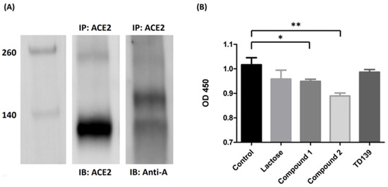 ACE2 contains blood group A antigen. (A) Western blotting analysis of ACE2 from the lung tissue of a blood group A patient. Lane 1: markers. Lane 2: the Western blotting of the lung tissue from blood group A patient immunoprecipitated with anti-ACE2 antibody and immunoblotted with anti-ACE2 antibody. Lane 3: the Western blotting of the lung tissue from blood group A patient immunoprecipitated with anti-ACE2 antibody and immunoblotted with anti-A antibody. (B) The binding inhibition assay of lactose or sulfated carbohydrate derivatives in blocking of the SARS-CoV-2 spike protein S1 subunit to ACE2. Compounds 1 and 2 showed a reduction in binding efficiency of ACE2 with the spike protein S1 subunit by 6.7% and 12.5%, respectively. TD139 exhibited no effects in spike protein S1 subunit–ACE2 interaction. * indicated p < 0.05; ** indicated p < 0.01.