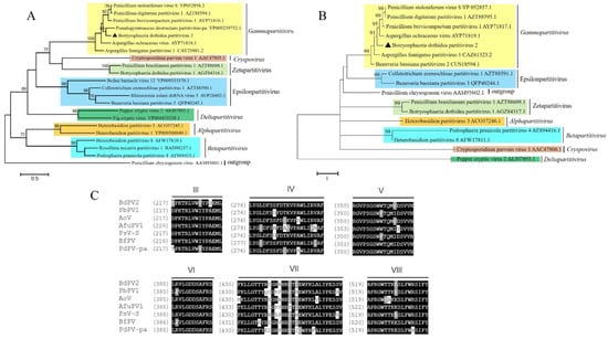 - Nibert, M.L.; Ghabrial, S.A.; Maiss, E.; Lesker, T.; Vainio, E.J.; Jiang, D.; Suzuki, N. Taxonomic reorganization of family Partitiviridae and other recent progress in partitivirus research. Virus Res. 2014, 188, 128–141. [Google Scholar] [CrossRef] [PubMed]
