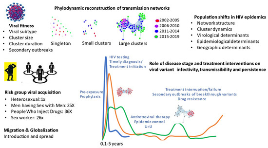 Phylogenetics provides a unique structural framework to track the spread of viral diseases, such as HIV-1 (human immunodeficiency virus type 1), the causative agent of AIDS (acquired immunodeficiency syndrome). Viral sequence datasets accrued from national surveillance programs can be analyzed using state-of-the-art bioinformatic tools to deduce genetic interrelatedness, ascertain sequence “clustering” and reconstruct transmission networks. Phylogenetics enhances our understanding of population-level transmission on chronological and stage of infection time scales (Figure 1).