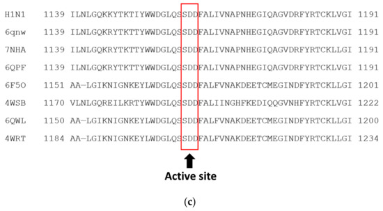 Subsequently, homologous sequences for the RdRp of MuV, MeV, and influenza H1N1 were retrieved using the BLAST (Basic Local Alignment Search Tool) software program (https://blast.ncbi.nlm.nih.gov/Blast.cgi, accessed on 21 May 2021) with the PDB [25]. Multiple sequence alignment was performed with CLUSTAL Omega web server (https://www.ebi.ac.uk/Tools/msa/clustalo/, accessed on 21 May 2021) to reveal the sequence conservation among the retrieved sequences [26]. Suitable template structures were determined by sequence identity to the target protein (MuV, MeV, and influenza H1N1).