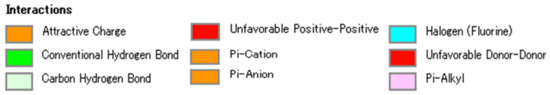 To validate the reliability of the present binding affinity prediction, we rescored and ranked these docking poses using PoseScore of the LigScore web service (https://modbase.compbio.ucsf.edu/poseandrank/, accessed on 12 January 2022). The PDBQT files of the docking poses were converted to mol2 files using Open Babel 2.4.0 [41].