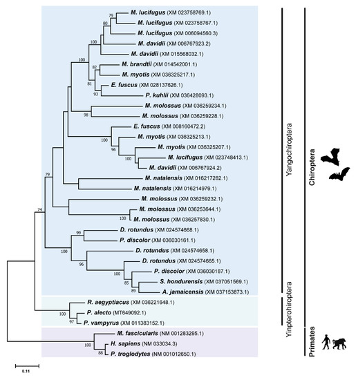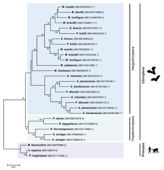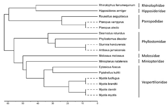 Phylogeny of the bat species included in this study. An ultrametric cladogram was generated using the iTOL tool [47], displaying updated phylogeny relations [35] of relevant members of the Chiroptera order. The length of branches represented by a dashed line is arbitrary and not proportional to the time scale.
