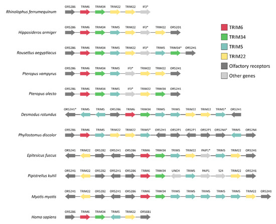 Next, the genomic organization of the TRIM6/34/5/22 gene cluster and respective flanking genes from different bat species were analyzed (Figure 4). For that, a synteny map was made exclusively with bat species in which the TRIM6/34/5/22 gene cluster was found in a single and unfragmented scaffold. The analysis of the flanking genes revealed a low conservation of the TRIM6/34/5/22 gene cluster among the analyzed genomes, where differences in gene copy numbers and organization can be observed (Figure 4). However, the presence of a single TRIM6 gene preceded by an olfactory receptor (Olfactory Receptor Family 52 Subfamily B member 6 (OR52B6) gene, or Olfactory Receptor Family 52 Subfamily H Member 1 (OR52H1) genes) is a common feature to all studied species. Overall, the genomic organization of the TRIM6/34/5/22 gene cluster shows, once more, the presence of multiple copies of the TRIM5 and/or TRIM22 genes in different bat genomes, further supporting the hypothesis that multiple events of duplication are shaping the evolution of these genes.