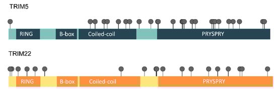 The human genome has approximately 100 genes coding for TRIM proteins [8,9]. These proteins are characterized by the presence of three canonical domains: an N-terminal RING domain, one or two B-Box domains, and a long coiled-coil domain, which together constitute the tripartite motif [10]. Many TRIM genes also code for a PRYSPRY (or B30.2) C-terminal domain, which contains four variable regions responsible for binding to viral exogenous material, making this domain crucial for viral restriction [11,12,13,14,15,16]. That is the case for the TRIM5, TRIM22, TRIM6, and TRIM34 genes, which, in the human genome, are all clustered on chromosome 11, surrounded on both sides by olfactory receptors [17]. The study of TRIM5 has proven to be a source of fundamental information for the understanding of host–virus interactions. TRIM5ɑ was initially identified in cells of Old World monkeys as a blocking factor that binds to the capsid of the human immunodeficiency virus type 1 (HIV-1), protecting the host cells against cross-species transmission of retroviruses [7]. Although HIV-1 is shielded from restriction by the human TRIM5ɑ in most cell lines due to CypA–capsid interactions [18,19,20], mutations as small as two amino-acids can produce anti-HIV-1 activity on a similar level [21,22]. The specificity of TRIM5ɑ was previously assigned to its variable loops [11], which show strong evidence of positive selection, a phenomenon that reflects the coevolution between a restriction factor and its viral protein target. Several reports also suggest that TRIM22 is able to restrict the replication of different viruses, including encephalomyocarditis virus (ECMV), porcine reproductive and respiratory syndrome virus (PRRSV), influenza A, and HIV-1 [23,24,25]. TRIM22 has also been implicated in other biological processes, including cell differentiation and proliferation [26]. Though there is more research published about TRIM5 and TRIM22 and their roles in virus restriction, it has also been shown that TRIM34 and TRIM6 do play a role in the immune response; TRIM34 appears to be capable of restricting HIV in a TRIM5-dependent manner [27], whereas TRIM6 was shown to be important in IFN-I signaling pathways [28].