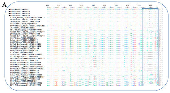To understand the molecular characteristics of virus isolates, phylogenetic analyses of whole-genome and VP1 sequences were performed by comparing nucleotide sequences of isolated PSV strains with published PSV sequences in the GenBank database. Furthermore, alignments of amino acid sequences of the VP1 protein were also carried out. Nucleotide and amino acid sequences were aligned using Clustal W software. Phylogenetic trees were constructed via the maximum-likelihood method using MEGA v.6.0 software with the neighbor-joining method with Kimura 2-parameter and 1000 bootstrap replicates [33,34].