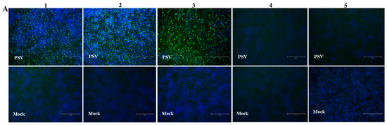 The indirect immunofluorescence assay (IFA) was conducted as previously described with slight modification [36]. Cell monolayers were inoculated with PSV at an MOI of 0.01 and incubated for 12 h. Cells were fixed with 4% paraformaldehyde, permeabilized with 0.1% Triton X-100, and blocked with 2% bovine serum albumin. A mAb specific for PSV-VP1 diluted 1:200 or swine serum at a 1:100 dilution was used as the primary antibody. The cells were then incubated with FITC-conjugated goat anti-mouse IgG 1:500 dilution (Thermo Fisher Scientific, Waltham, MA USA) or rabbit anti-pig IgG 1:50 dilution (Sigma, St. Louis, MO, USA). Nuclei were stained with 10 µg/mL DAPI (Solarbio, Beijing, China), and cells were then visualized under an inverted fluorescence microscope (Evos FL, Thermo-Fisher, Bothell, WA, USA).