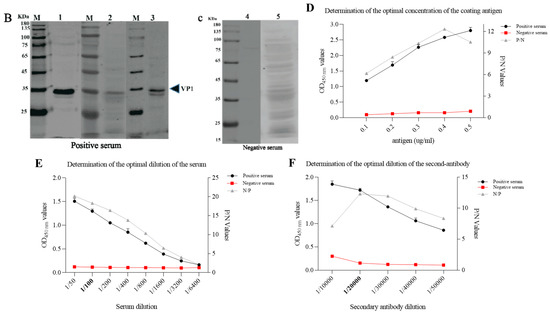 To optimize the iELISA, the checkerboard titration was performed to determine the optimal concentration of the antigen and the serum. The results showed that the optimal antigen coating concentration was 0.2 µg/mL and the optimal dilution for serum was 1:100 (Figure 6D,E). Using this optimal dilution of coating protein and primary antibody, the optimal dilution of the HRP-conjugated goat anti-porcine IgG was determined to be 1:20,000, as shown in Figure 6F.