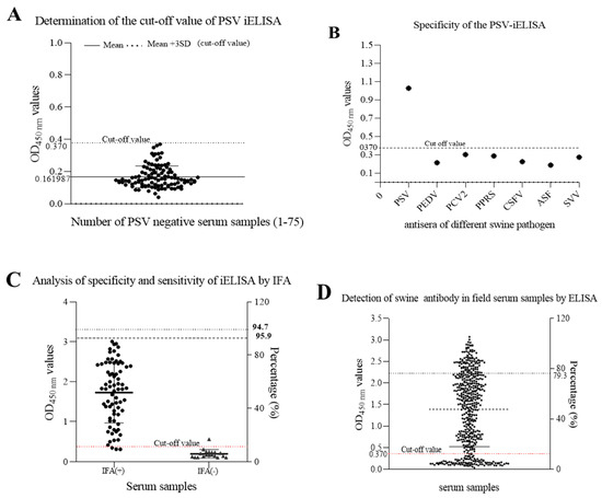 Detection of anti-PSV antibodies in swine serum by the developed iELISA. (A) seventy-five PSV-negative serum samples were tested using iELISA and the mean OD450 value of PSV-negative serum plus three standard deviations (SDs) were used to calculate the cutoff value. (B) Identification of iELISA specificity by cross-reaction test. Positive swine serum against PSV, PEDV, PCV2, PRRS, CSFV, ASFV and SVV were tested by iELISA. The average of OD450 values were calculated to determine the tested serum according to the cut-off value. (C) The sensitivity and specificity of the developed ELISA were assessed based on the IFA result. (D) Detection of anti-PSV antibodies from field swine serum samples by the developed iELISA.