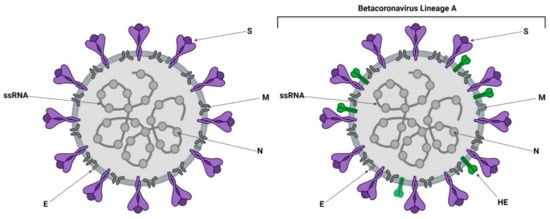Lineage A betacoronaviruses, including mouse hepatitis virus (MHV) and bovine coronavirus (BCoV), differ from other coronaviruses as their virions possess two types of surface proteins (Figure 2), both of which play key roles in attachment and receptor-binding [92]. In addition to the S glycoprotein, they also encompass 8-nm protrusions, unique to this clade of viruses, comprised of the homodimer hemagglutinin-esterase (HE). The HE protein is multi-functional, with orthologs embedded in the envelope of several viruses, not just coronaviruses, including both toroviruses and Influenza C viruses [36,124]. HE monomers have a bimodular structure with a carbohydrate-binding (lectin—R) domain attached to an enzymatically active sialate-O-acetylesterase (esterase—E) domain and a membrane-proximal domain (MP) [124,125,126] (Figure 7). HE, acts as a receptor-destroying enzyme (RDE) due to the presence of an appended 9-O-acetylated sialic acid-specific lectin domain (Figure 8 and Figure 9) [127]. The esterase region of the HE protein is responsible for the destruction of the receptor, the same action that is displayed by the neuraminidase protein in influenza A and B viruses [126]. Zeng et al. [126] have shown that the CoV HE arose from an influenza C-like HE fusion protein (HEF). The HE was transformed from a trimer into a dimer, with remnants of the fusion domain adapted to establish novel monomer–monomer contacts [126].