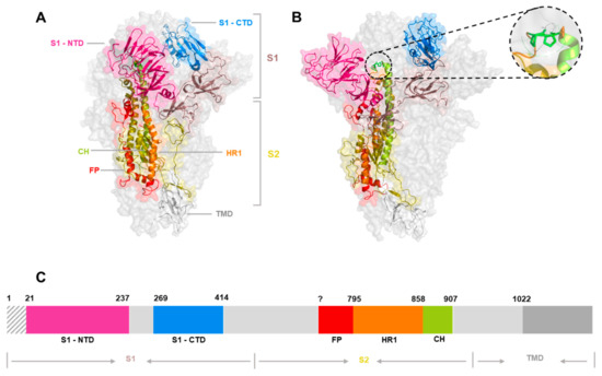 For a comprehensive understanding of coronavirus receptor-binding, it is necessary to understand the role and function of the S glycoprotein, which is categorised into three segments (Figure 4A); an ectodomain, a single-pass transmembrane anchor and a short intracellular tail [43,44]. The ectodomain can be further divided into two subunits—the S1 subunit, which mediates receptor-binding, and the S2 subunit, which mediates virus-to-cell and cell-to-cell fusion [45,46]. Two structurally distinct conformations are recognised; pre- and post-fusion [47,48,49]. The pre-fusion conformation protrudes outwards from the virion and consists of the S1 globular head sat upon the S2 stalk. Upon receptor-binding by the S1 subunit, an irreversible conformational switch occurs from the pre-fusion to post-fusion state, allowing the S2 subunit to fuse viral and cellular membranes [43,48,50,51]. The S2 subunit contains two heptad repeats (HR), HR1 and HR2, which are in the form of extended α helices, as well as the fusion peptide [45,52,53]. It is the HR1 and HR2 sections of S2 that fuse the viral membranes and carry out this irreversible conformational change [48,54,55]. The resulting series of conformational changes enables the fusion peptide to insert into the host membrane, forming a pre-hairpin intermediate state [56]. Although receptor-binding initiates the conformational changes which drives virus-cell membrane fusion [48], additional factors in the entry pathway include pH acidification, temperature changes or proteolytic activation. IBV [57] and SARS-CoV [58], have been shown to utilise the pH-dependent endocytic pathway. SARS-CoV has also been shown to rely on the activity of host cell proteases, which cleave and activate the S glycoprotein [59]. SARS-CoV-2 research has also identified that temperature may influence the affinity of S glycoprotein–receptor interactions with SARS-CoV-2 binding affinity to ACE2 (angiotensin converting enzyme II) decreasing at higher than optimal temperatures [60].