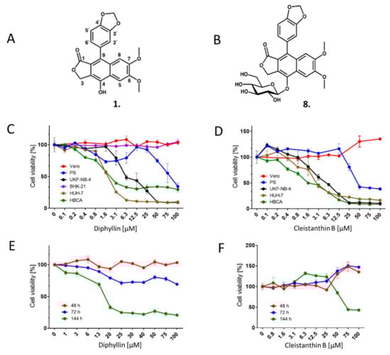 The cytotoxicities of diphyllin 1 and diphyllinoside cleistanthin B 8 were determined with respect to five different immortalized cell lines (i.e., Vero, PS, BHK-21, UKF-NB-4, and Huh-7 cells) and primary HBCA cells. These cells were used since they are often used for in vitro cultivation and for antiviral assays with numerous medically important viruses. The UKF-NB-4 and HBCA cells are of neural origin and so are highly suitable for in vitro multiplication and antiviral studies involving neurotropic viruses. Diphyllin 1 and cleistanthin B 8 were found to be substantially cytotoxic to UKF-NB-4, Huh-7, and HBCA cells 48 h post-administration, in a dose-dependent manner (Figure 1C,D).