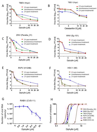 Antiviral activities of diphyllin 1 and cleistanthin B 8. (A,C–F) Anti-antiviral activities of diphyllin 1. Vero cell monolayers were treated with diphyllin 1 (0 to 25 µM) either 2 h prior to TBEV (A), ZIKV (C), WNV (D), RVFV (E), and HSV-1 (F) infection (at a MOI of 0.1) (2 h pre-treatment), simultaneously with virus infection (simultaneous treatment), or 2 h after infection (2 h post-treatment). The infected cells were then incubated for 48 h, after which cell media were collected, and viral titers were determined using a plaque assay and expressed as PFU/mL. (B) Anti-TBEV activity of cleistanthin B 8 (0 to 25 µM). The experimental procedure was the same as in (A). (G) Anti-RABV activity of diphyllin 1. A suspension of BHK-21 cells was incubated with diphyllin 1 (0 to 25 µM) and with RABV (106.58 TCID50/mL) at 37 °C for 40 mins. Following incubation, the RABV-infected cells were seeded on 96 well plates and cultivated for 72 h then, media were collected, and the RABV RNA was quantified by RT-qPCR. (H) Inhibition curves for diphyllin 1 were constructed from the viral titer values (2 h pre-treatment) in order to estimate EC50 values for the indicated viruses. The mean titers from three biological replicates of two independent experiments are shown, and error bars indicate standard errors of the mean (n = 3). The horizontal dashed line indicates the minimum detectable threshold of 1.44 log10 PFU/mL. MI, MacIntyre.
