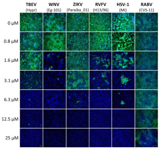 In order to measure the compound-induced inhibition of viral antigen expression, a cell-based immunostaining assay for TBEV, WNV, ZIKV, RVFV, RABV, and HSV-1 was performed. Vero cells were used for the cultivation of TBEV, WNV, ZIKV, RVFV, and HSV-1 and BHK-1 cells for RABV cultivation.