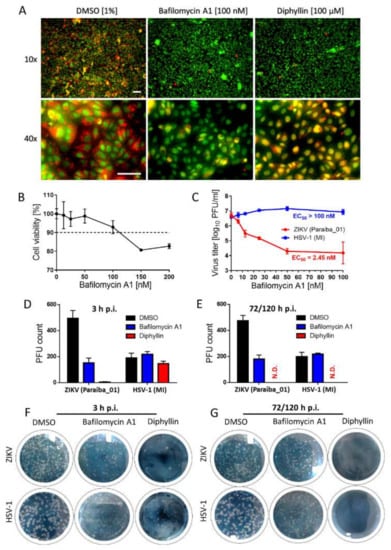 Antiviral assays with bafilomycin A1 were performed with Vero cells seeded in 96-well plates (2 × 104 cells per well) and incubated for 24 h at 37 °C under 5% CO2 to form a confluent monolayer. Media containing bafilomycin A1 (0 to 100 nM) were simultaneously infected with ZIKV (strain Paraiba_01) or HSV-1 (strain MacIntyre) (MOI of 0.1) and added to cells that were then incubated for 48 h at 37 °C under 5% CO2. Viral titers were determined by plaque assays.