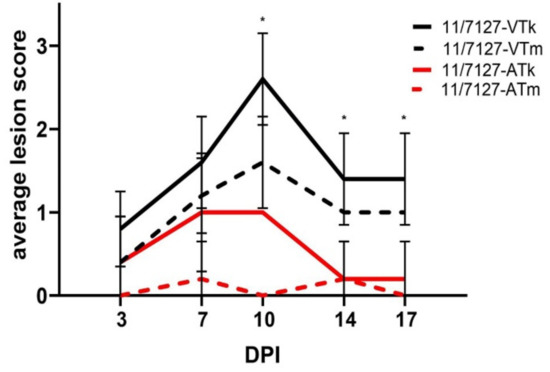 3.3. In Vivo Study—Clinical Signs and Lesions