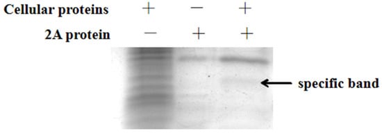 Binding specificity to the 2A protein by SDS-PAGE was analyzed by mass spectrometry. Protein slices in fresh CCB-stained gel were excised, destained twice with 50 v/v acetonitrile and 50 mM NH4HCO3, and dried with acetonitrile three times. Then, the dried gel slices were incubated in ice-cold digestion solution (20 mM NH4HCO3 and trypsin 12.5 ng μL−1) at 37 °C overnight. Finally, peptides in the supernatant were collected after extraction twice with extract solution (5 v/v formic acid in 50 v/v acetonitrile). The peptides collected in the previous step were analyzed by Nano-HPLC-MS/MS. Tandem mass spectra were extracted by Proteome Discoverer software (version 2.4; Thermo Fisher Scientific, Waltham, MA, USA). Peptide confidence was set to high, and peptide ion score was set to >20.