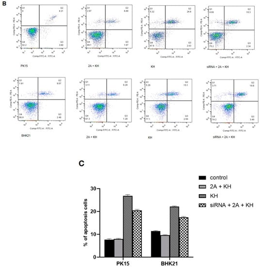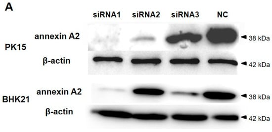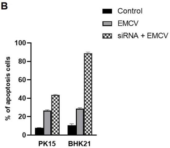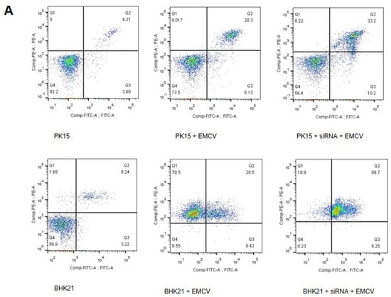 EMCV has been described as a lytic virus in BHK21 cells and promotes virus proliferation by inhibiting apoptosis []. Cells of PK15 and BHK21 treated with siRNAs targeting annexin A2 were then infected with EMCV. Reducing annexin A2 increased apoptosis in the infection of EMCV. The levels of cells apoptosis were evaluated by flow cytometry (Figure 5A,B).