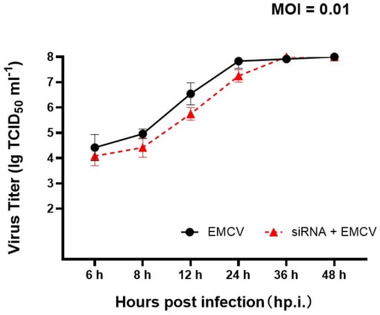 The titers of EMCV HB10 were determined by endpoint dilution assays, and the 50% cell culture infection dose (TCID50) was calculated to determine the replication kinetics of the virus in BHK21 cells. Briefly, cells were seeded onto 96-well microtiter plates and infected with 10-fold serial dilutions of EMCV (1:10−1 to 1:10−8) separately after siRNA treatment for 24 h. The cytopathic effect (CPE) of the cultures was observed at different time intervals up to 48 h post infection (hp.i.). Assays were performed in triplicate. Each data point represents the average of three independent experiments.