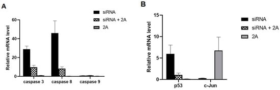 A previous study indicated that annexin A2 suppresses the expression of p53 resulting in the decrease of p53 dependent cell apoptosis, and JNK is activated during this process []. In this study, BHK21 cells reducing annexin A2 by siRNA were transfected with pcDNA3.1-2A. The changes of JNK/c-Jun pathway factors in the cells were detected by RT-PCR and Western blot. As shown in Figure 7A, reducing annexin A2 led to the increase of caspase 3/8 activity in BHK21 cells but had no effect on caspase 9. In contrast, increased the 2A protein and reduced annexin A2 significantly decreased the activity of caspase 3/8 in BHK21 cells. BHK21 cells overexpressing the 2A protein did not cause the activation of caspase 3/8/9. At the same time, overexpressed 2A protein also decreased p53 expression and promoted the activation of c-Jun and JNK (Figure 7B,C). Our findings showed that the activation of c-Jun and JNK is directly proportional to the expression of the 2A protein (Figure 7D,E).