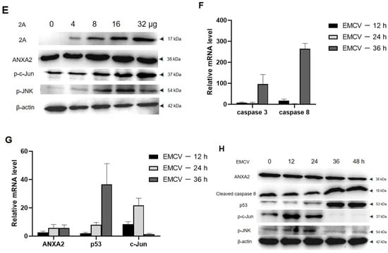 The activities of c-Jun and JNK in EMCV-infected BHK-21 cells peaked at 12 and 24 h of infection and decreased at 36 h. Correspondingly, the expression of caspase 3/8 and p53 increased after 36 h of virus infection (Figure 7F,G). At 36 h after EMCV infection, the phosphorylation of c-Jun decreased significantly. The data implicated that other factors are involved in accelerating apoptosis in the late reproductive stage of EMCV. These results showed that the 2A protein inhibits apoptosis by interacting with annexin A2 mainly within 24 h after virus infection. Furthermore, western blot analysis showed the same results (Figure 7H). The changes of these pathway factors indicated that annexin A2 interacted with the 2A protein inhibits apoptosis through JNK/c-Jun pathway in the early stage of virus infection.