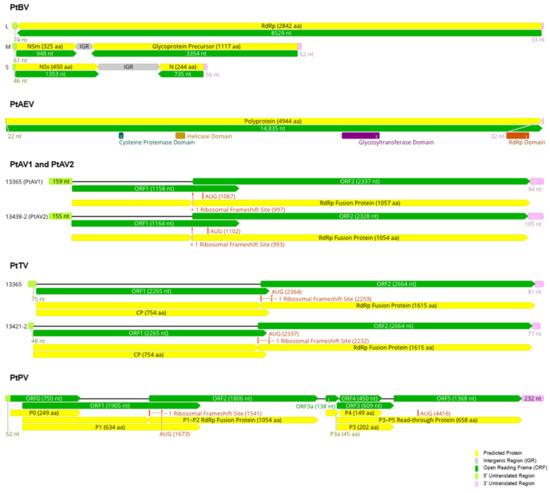 Genome architectures of the viruses identified in this study. Abbreviations are as follows: PtAEV, Pterostylis alphaendornavirus; PtAV1, Pterostylis amalgavirus 1; PtAV2, Pterostylis amalgavirus 2; PtTV, Pterostylis totivirus; PtPV, Pterostylis polerovirus; RdRp, RNA-dependent RNA polymerase; NSm, non-structural protein, M segment; NSs, non-structural protein, S segment; N, nucleocapsid protein; CP, capsid protein; nt, nucleotide; aa, amino acid.