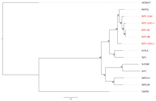 In a phylogenetic reconstruction using the RdRp sequence alignment, both PtAV1 and PtAV2 clustered within the genus Amalgavirus but in different positions of the tree (Figure 5). PtAV1 formed its own distinctive clade, while PtAV2 clustered with southern tomato virus (STV), Allium cepa amalgavirus 1 (AcAV1), Allium cepa amalgavirus 2 (AcAV2), rhododendron virus A (RhVA), spinach amalgavirus 1 (SpAV1) and Vicia cryptic virus M (VCVM, Figure 5). Species demarcation criteria have yet to be set for the genus Amalgavirus. However, members of the family Partitiviridae have a homologous RdRp [40], and the species demarcation criterion for species in this family is ≤90% aa sequence identity in the RdRp [41]. As PtAV1 and PtAV2 have not more than 60% aa identity to each other and to any other known amalgavirus species in the RdRp (Tables S12 and S13), we suggest that they each should be classified in a new species in the genus. The genomes of the other nine PtAV1, each 3175 nt in length excluding the 5′ and 3′ UTRs, were deposited in GenBank with accession numbers OL471322 to OL471330.
