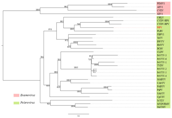 The predicted protein products of PtPV all have less than 70% aa sequence identity to their respective closest relatives (Table S16), suggesting that PtPV should be classified in a new species in the genus Polerovirus given the species demarcation criterion of more than 10% difference in the aa sequence identity of any gene product [44].